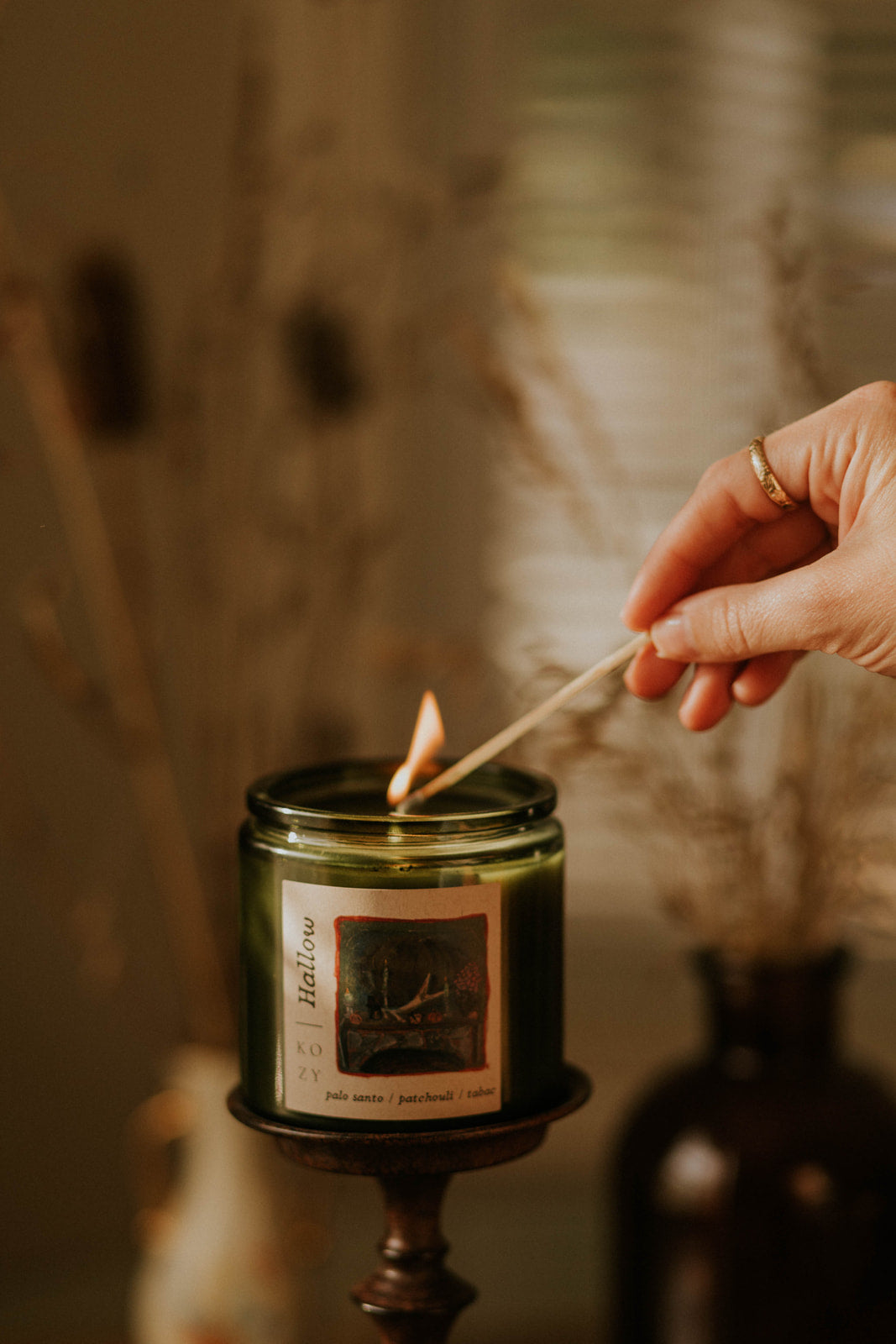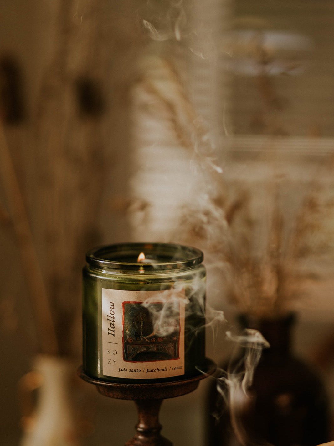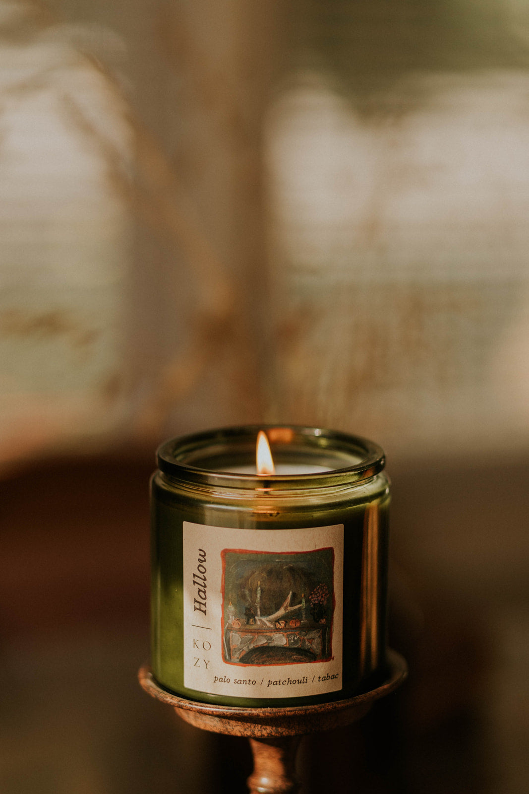 Dark patchouli and rich tobacco leaf entwine with sacred palo santo. Hallow is mystical, grounding, and reverent—like stepping into a temple of autumn nights.